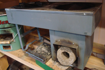 The briquette burns just from one side and through the hole, which makes a steady burn with less smoke. Briquettes are fed continuously from the side of the stove, where you can add a door to manipulate the volume.