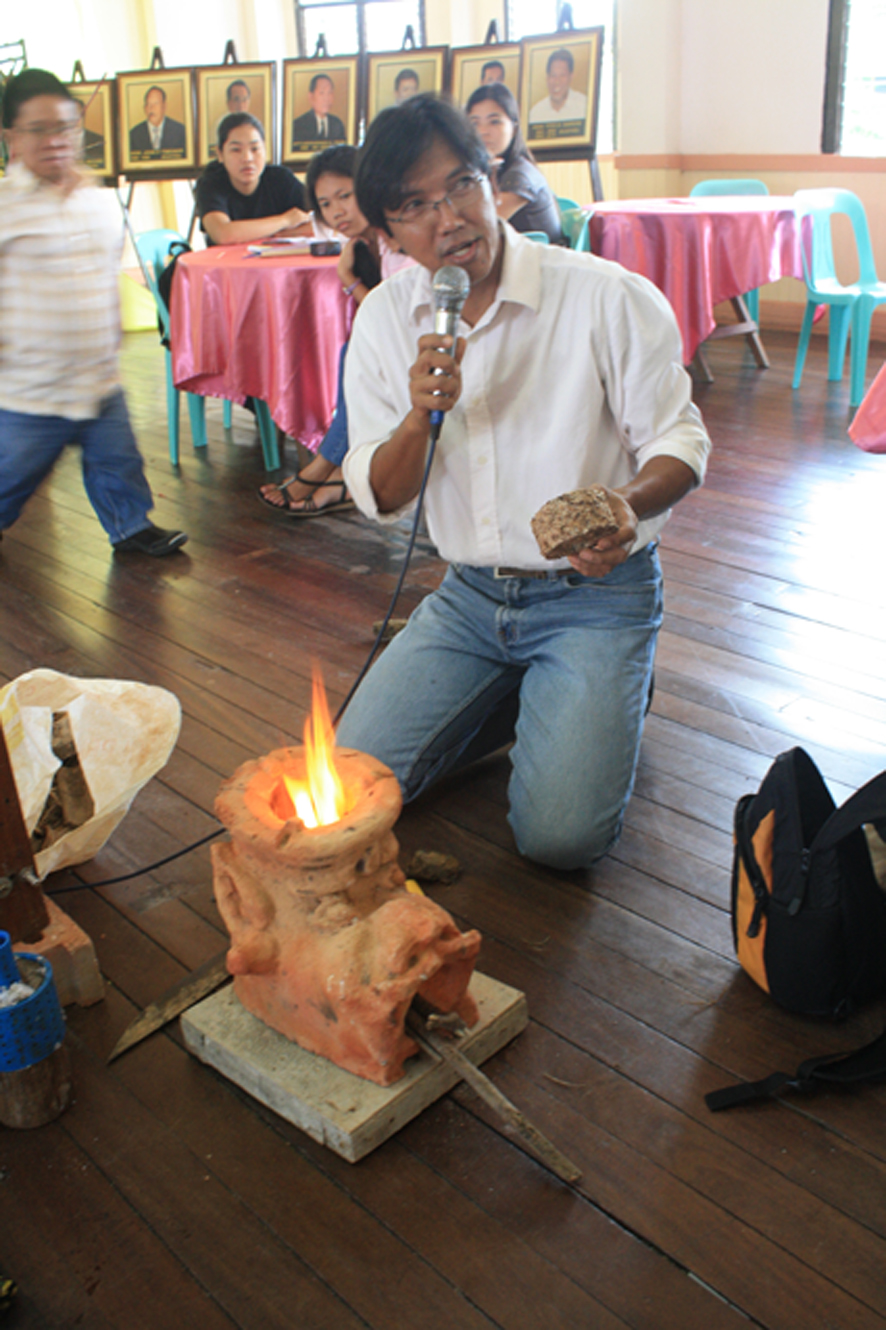 Joshua demonstrating briquette and stove technology